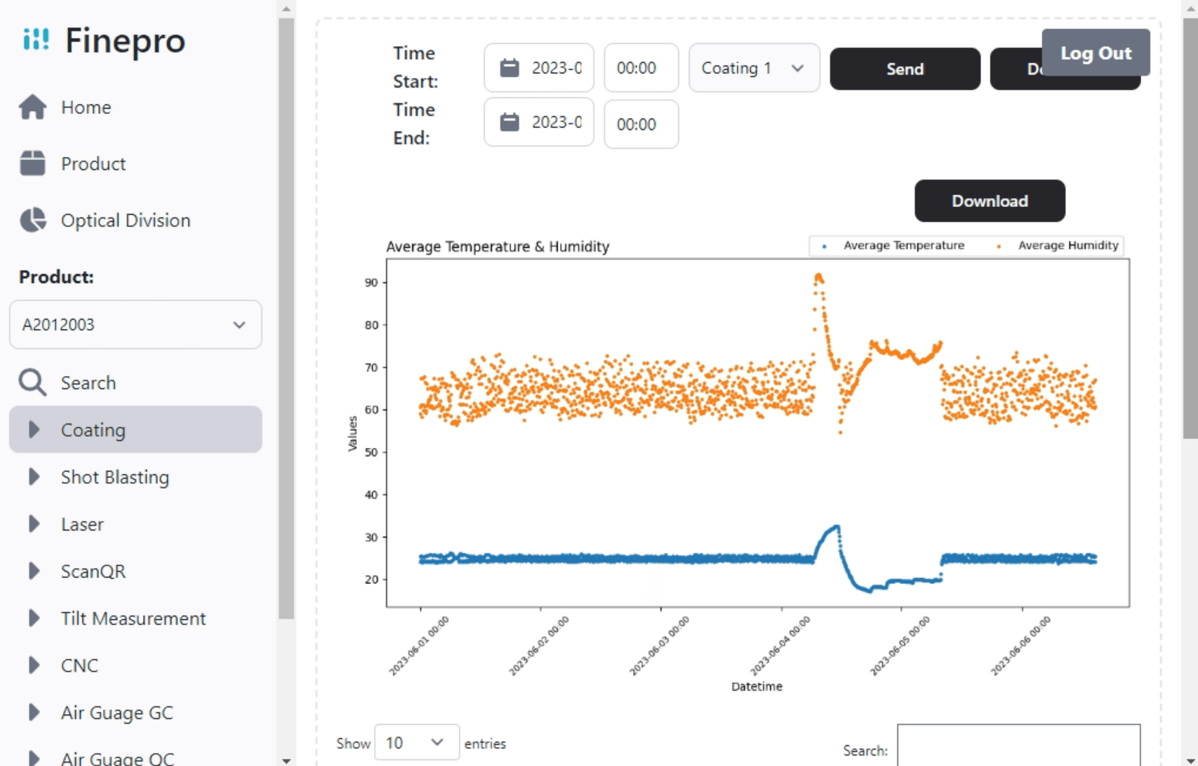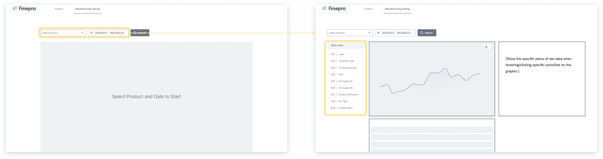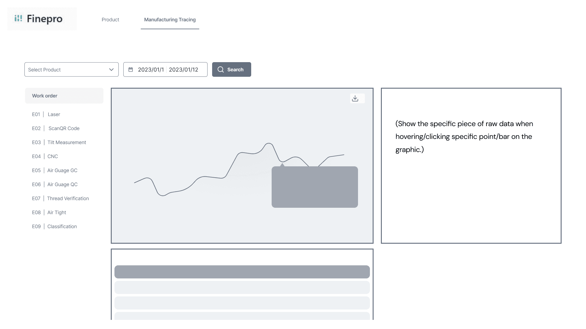Internal staff can retrieve graph and raw data for past production record. The goal is to retrieve data for abnormalities within the production process.