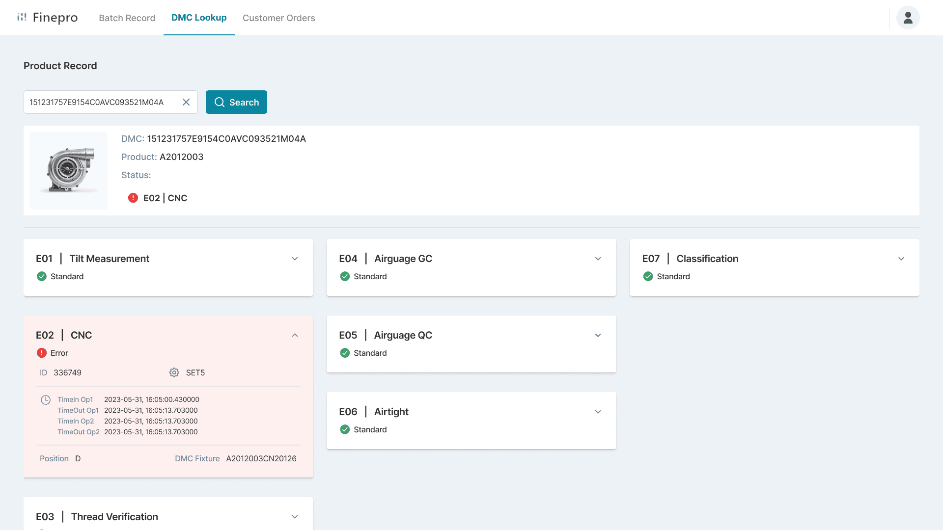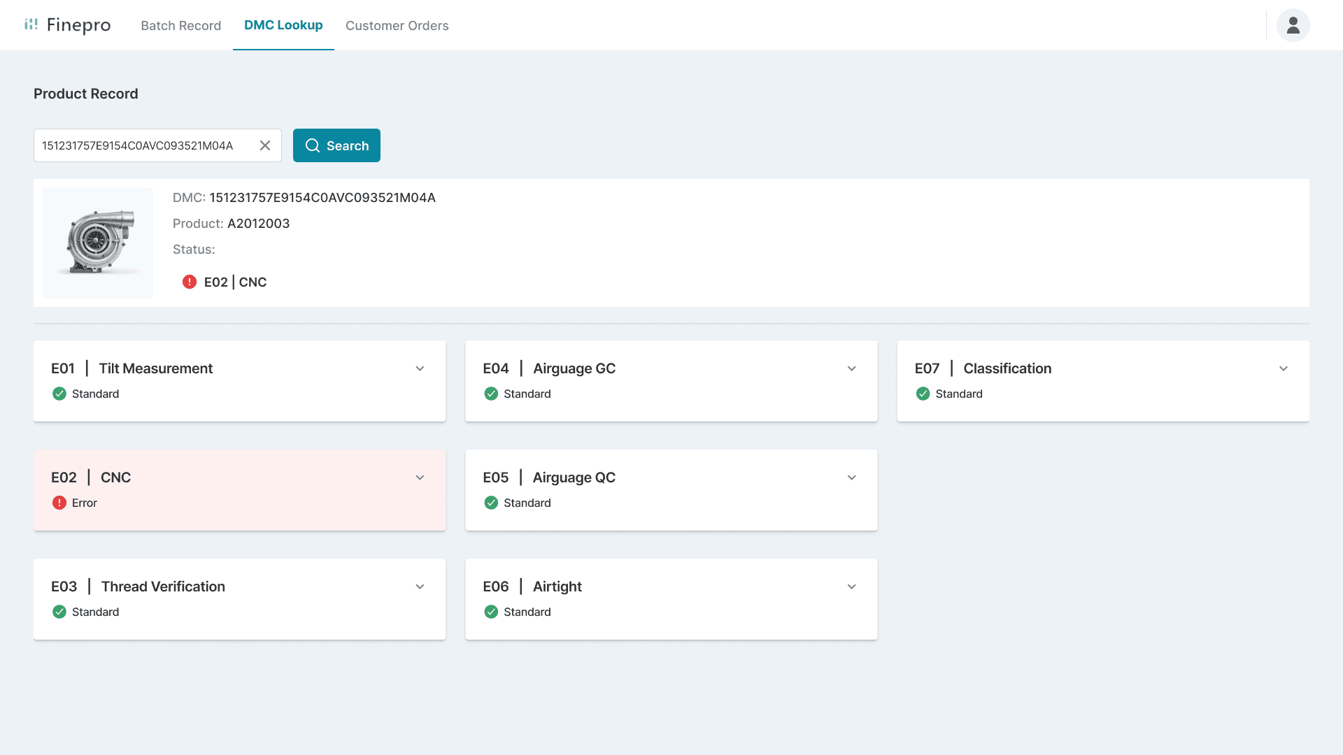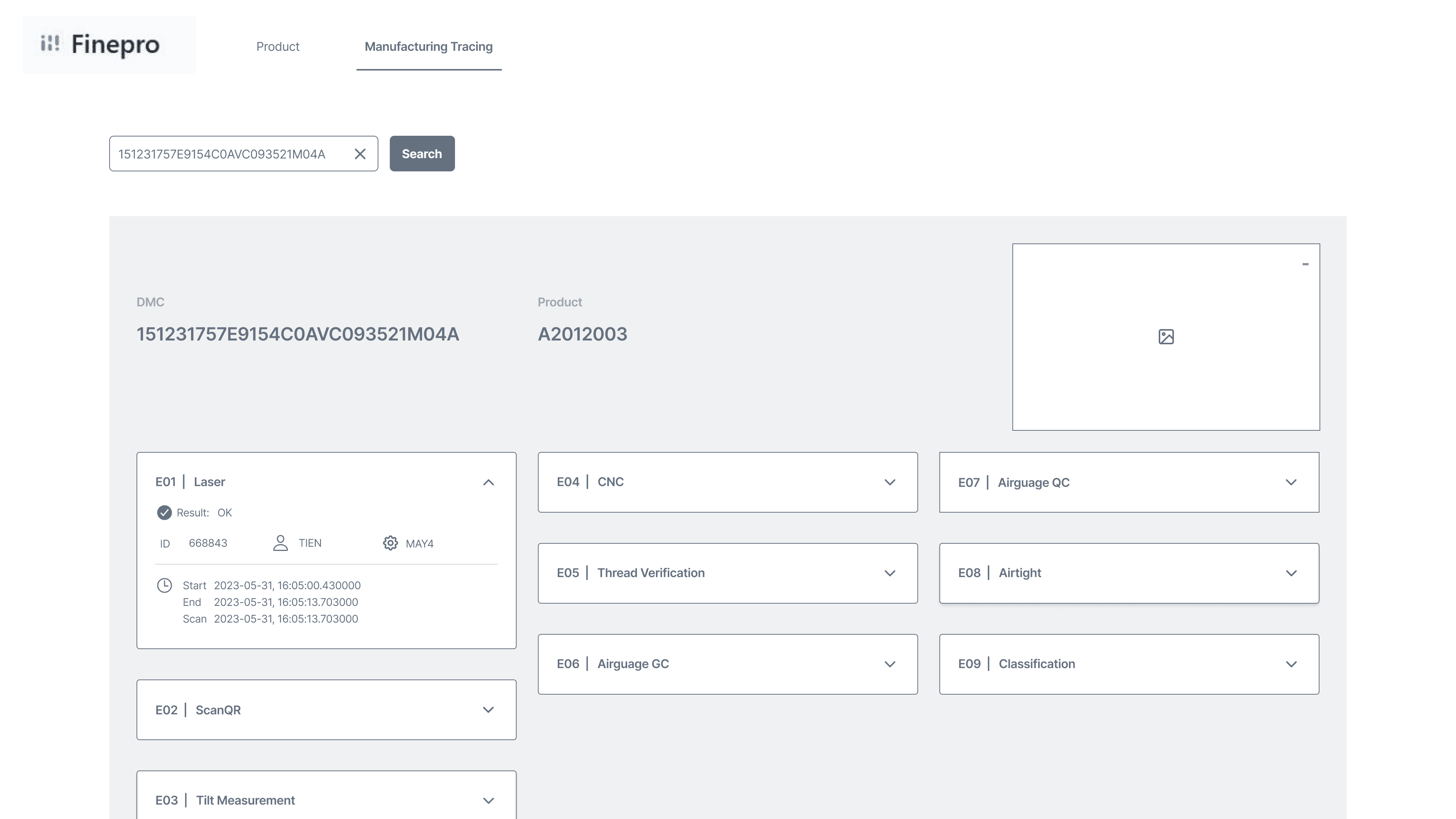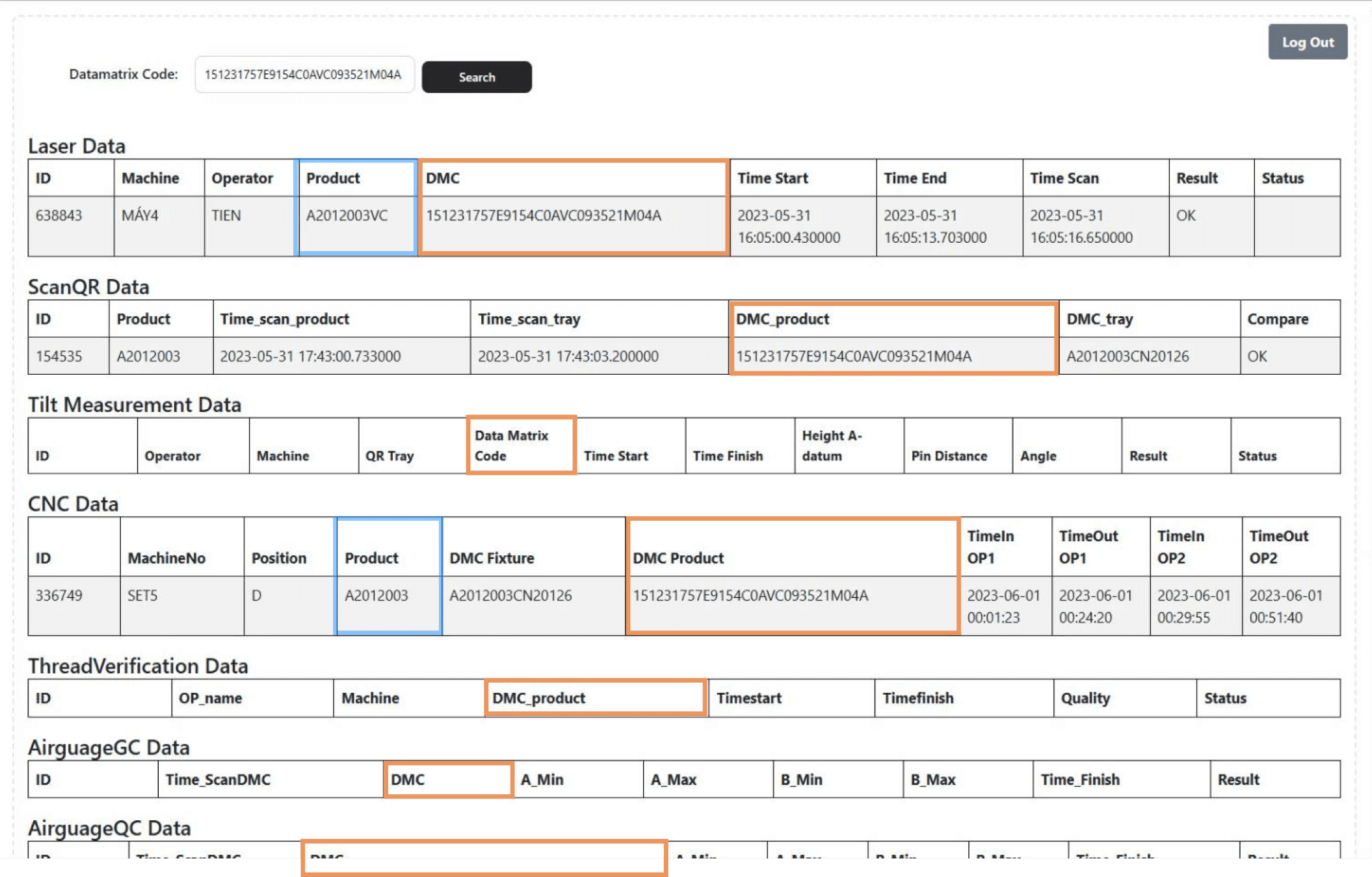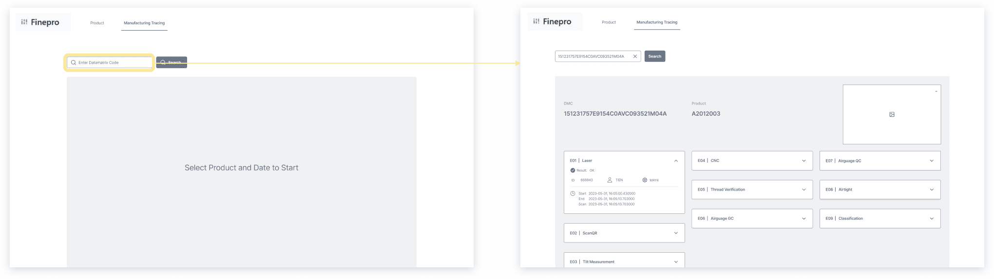 Internal staff can look up individual product's production data through entering the DMC (Data Matrix Code) manually or using the DMC scanner.