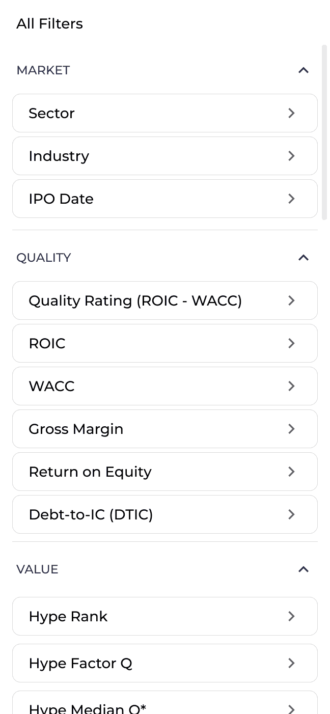 To avoid the complexity of slider labels and make filter setup more approachable for new investors, I decided to use labeled select options for quick selection.