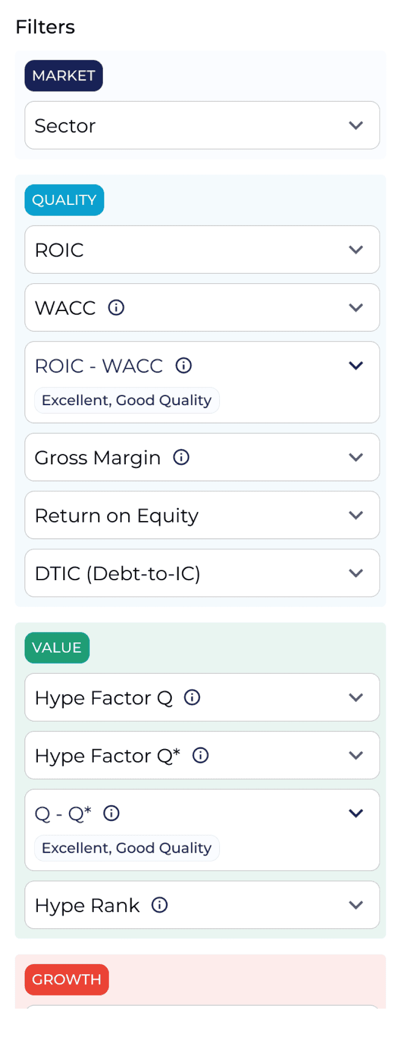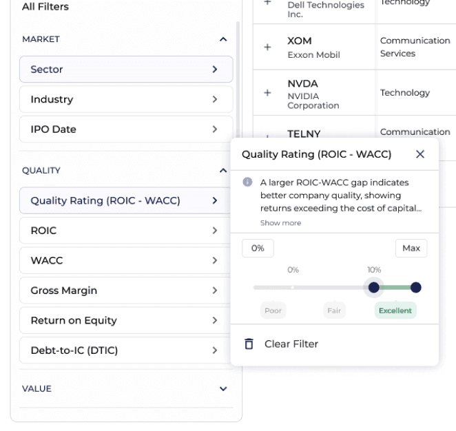 Use color coding to convey positive and negative investment meanings, such as green for Excellent Quality, yellow for Fair Quality, and red for Poor Quality, helping users intuitively setting up filter range.